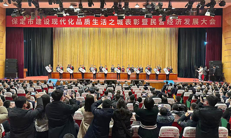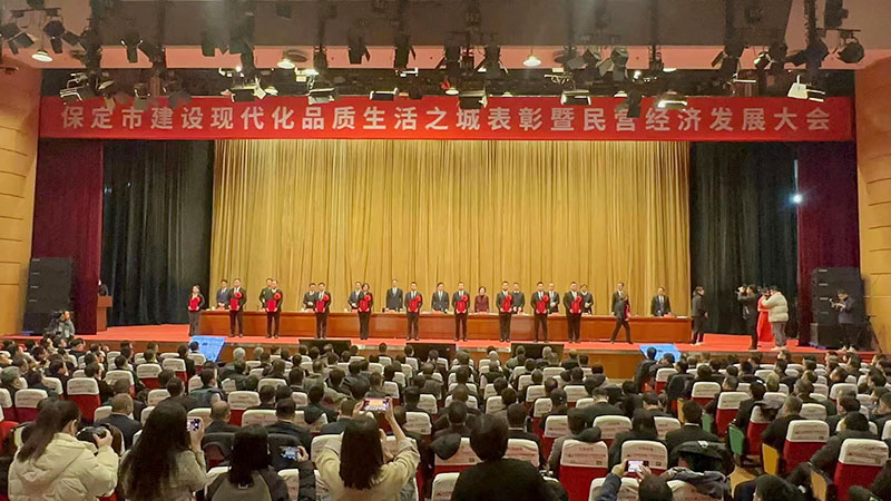 2023年1月28日,河北省保定市召开建设现代化品质生活之城表彰暨民营经济发展大会,对高质量发展的集体和个人进行了表彰。保定富阳电力科技有限公司(以下简称“富阳电力”)荣获“优秀民营企业”称号,会上,保定市委书记党晓龙为获奖企业颁发奖牌,富阳电力董事长赵洋阳先生上台领奖。